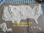 So, yesterday we made the United States from salt dough. Each boy used a batch for themselves and then a batch split for the mountains. Cowboy made little balls and connected them, but Engineer just made “hot dogs” on top. They decided this time they would not draw the states with a toothpick. I was hoping at least someone would, but I did say that they could do it how they liked: adding states, mountains, rivers, trails, Great Lakes, and other features. We were able to talk about each state as we talked about the placement of the mountains. (Note to Moms: you must draw in the States, if you choose to or add the mountains BEFORE the dough dries unless you want to just paint them.) My Engineer starting by drawing a map & the others soon followed his lead.